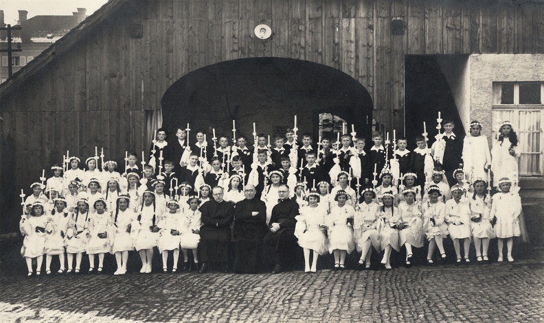 20er Jahre, Hendsemer Kinder feiern Weißen Sonntag. Aufnahme Hofseite vor dem katholischen Gemeindehaus in der Pfarrgasse. Mitte, mit Brille Pfarrer Rudolf. - Bitte um weitere Daten bzw. Namensergänzungen -