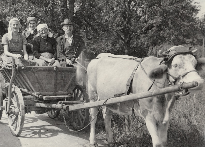 Johann Kücherer und Hans Genthner mit Kuhgespann auf der Dossenheimer Landstraße. Bildstandort etwa heutige HSB-Endstelle, ca. 1930