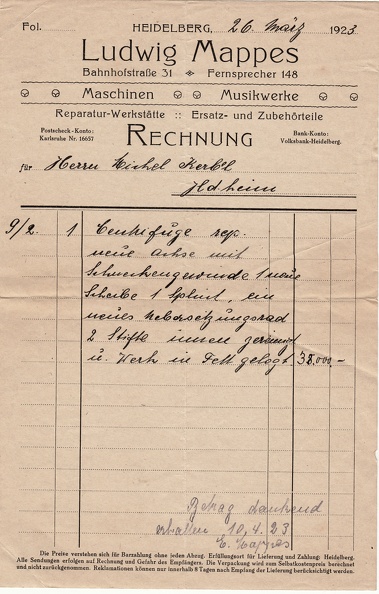 Rechnung von Schmiedemeister Adam Elfner 1916 Archiv, Sammlung Körbel