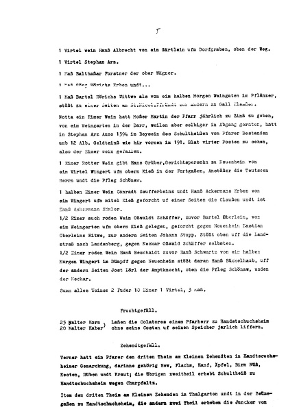 Eine der ältesten, deutschsprachigen Urkunden im Besitz des Tiefburgarchives ist das Zinsbuch der reformierten Kirchengemeinde Handschuhsheim um 1600. Es regelte, mit dem Segen des Kurfürsten Ottheinrich, die Einkünfte der Pfarrei, des Handschuhsheimer Pfarrers, des Messners und ihrer Angehörigen. Durch die detaillierten Angaben der Pfründe sind auch viele Rückschlüsse zum Grundbesitz ehemaliger oder noch existierender Handschuhsheimer Familien vor dem 30-jährigen Krieg möglich. 17 Seiten handschriftlicher Originale sowie 7 Seiten Übersetzungen, 1972 von Dr. Martin Jordan, in Maschinenschrift.