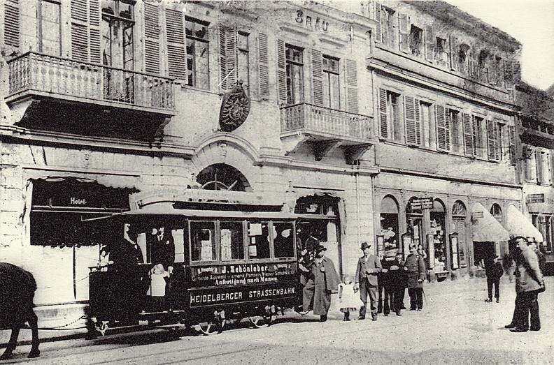 links Schrieder Hotel, dahinter Straßenbahn zum alten Bahnhof, Kreuzung rechts zur Friedrich-Ebert-Anlage