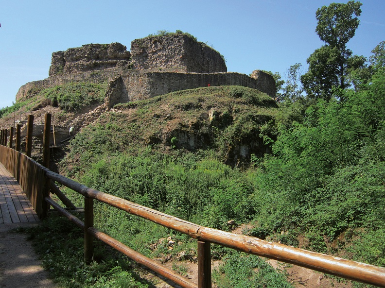 Die Reste der Schauenburg (erbaut 1130) in Dossenheim. Blick zu der 2009 neu errichteten Holzbrücke am historischen Weg über den alten Burggraben. Seit 1982 aktive Sicherungs-und Teilrestaurierungsarbeiten durch die Arbeitsgemeinschaft Schauenburg des Heimatvereins Dossenheim. Aufnahme Mai 2014.