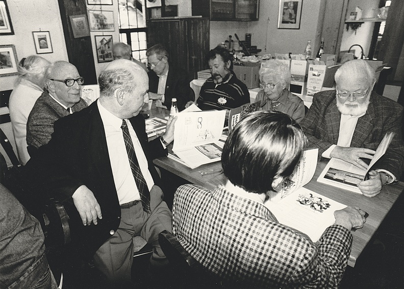 Vorstellung des Handschuhsheimer Jahrbuchs 1991 in der Ritterstube. Unter den Autoren: Dr. Berndmark Heukemes, Ludwig Merz, Heiner Pfeiffer, Kurt Hasslinger u.v.a. Juli 1991. Foto Welker, Tiefburgarchiv
