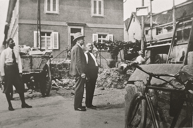 Meister Heinrich Schmitt Sieht zur Kamera, sein Helfer Maurer Heinrich Selzer stets an seiner Seite. Im Vordergrund sind die kreisrunden Fenstergewände des östlichen Seitenflügels schon zu erahnen.