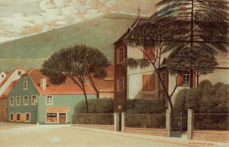 Frühling 1937, Schlösschen und Remise (Bäderanbau) von der Rosenapotheke gesehen.