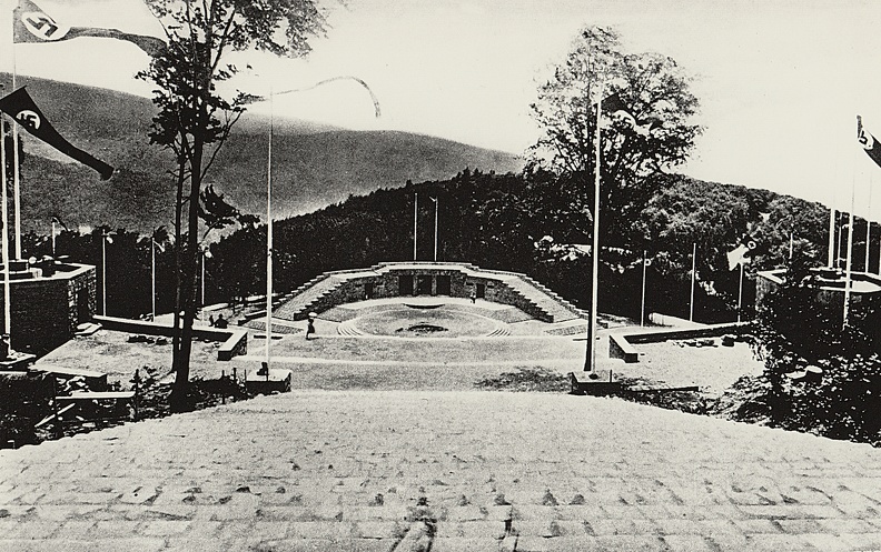 1921, Die Handschuhsheimer Turner beim Bau des "Turnerbrunnens" im Mühltal zum Gedenken an die im Krieg gefallenen Sportkameraden. Im Vordergrund links, stehend Architekt Jakob Frauenfeld.