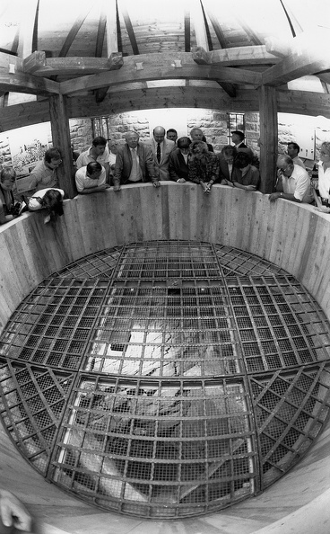Blick in den 56 Meter tiefen keltischen Kultschacht "Heidenloch" während der Reinigungs-und Sicherungsarbeiten im Juni 1987.