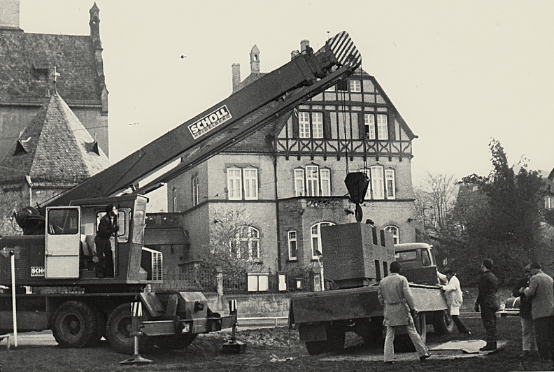 Entladen des Gedenksteins durch Schwerlastkran Fa. Scholl, Herbst 1971. Archiv, Ordner Mahnmal